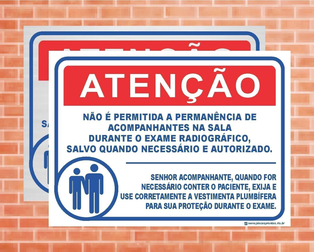 Placa de Sinalização consultório Atenção Não é permitida a permanência de acompanhantes na sala durante o exame radiográfico, salvo quando necessário e autorizado. Senhor acompanhante, quando for necessário conter o paciente, exija e use corretamente a vestimenta plumbífera para sua proteção durante o exame.